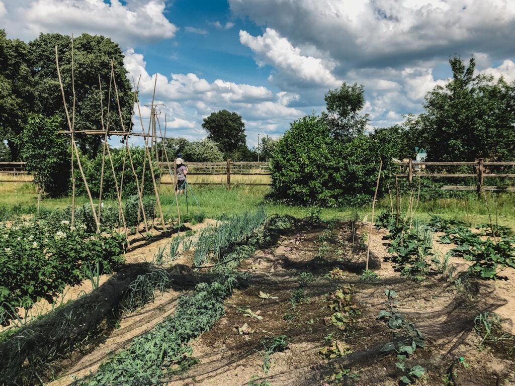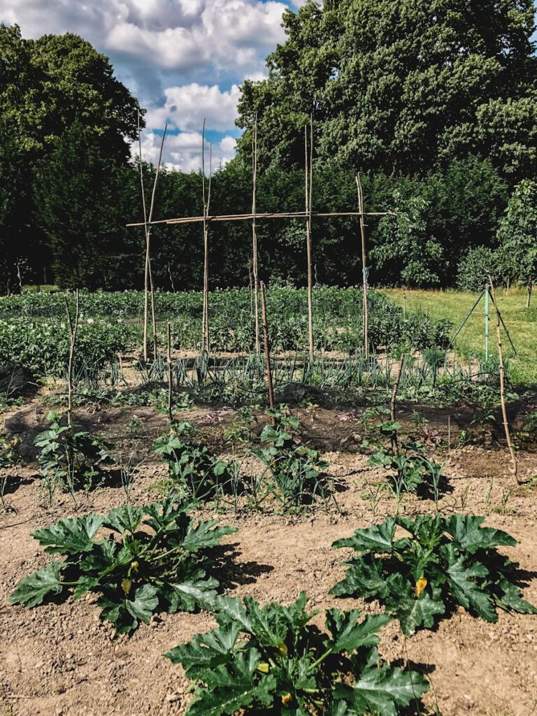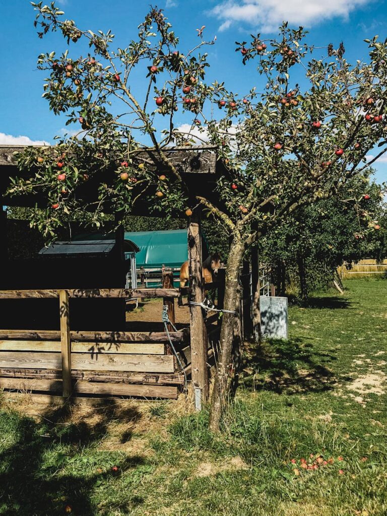 Unser Acker liegt auf dem Grundstück eines Biobetriebes. Alles ist wunderschön klein gehalten, neben unserem Acker stehen noch drei weitere Felder zur Verfügung, sodass eine Art kleine Ackerfamilie entstanden ist. Die Felder sind eingezäunt, so dass wir unseren Bo unbesorgt herumlaufen lassen können. Nebenan ist direkt die Pferdekoppel, mit drei Pferden, die zum Einen für den Dünger der Felder sorgen und zum Anderen als Nutztiere für die landwirtschaftlichen Arbeiten eingesetzt werden. Hinter den Feldern leben noch die Ackerhühnern, die am Liebsten unser Unkraut futtern. Alles ist umgeben von Obstbäumen und Obststräuchern.